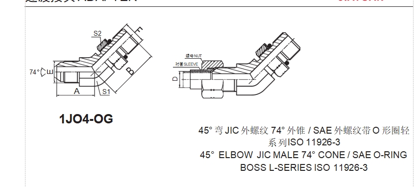 Part No.: 1JO4-OG/45° ELBOW JIC MALE 74° CONE / SAE O-RING